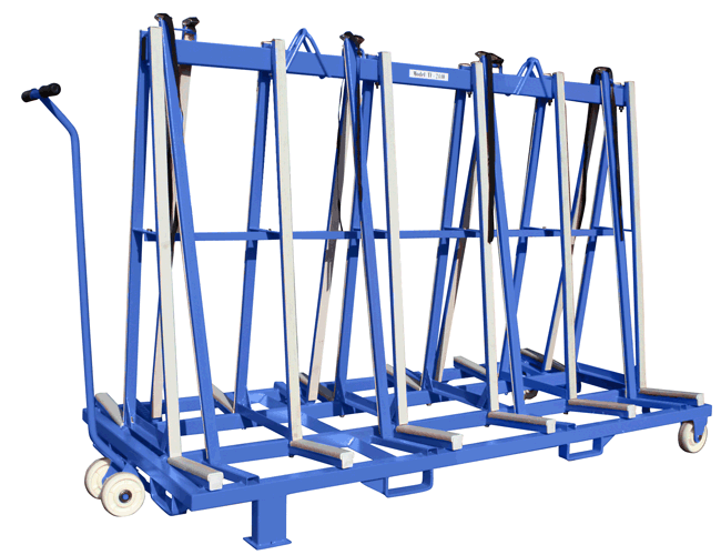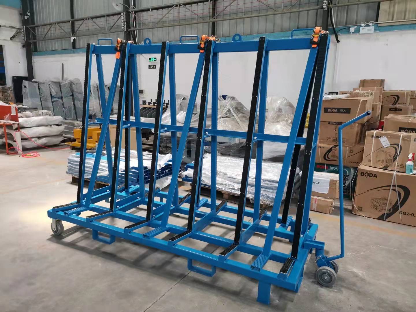 此設(shè)計(jì)用于廠區(qū)內(nèi)外的板材運(yùn)輸和儲(chǔ)存,支架表面覆蓋一層橡膠層,保護(hù)板材免于刮傷。